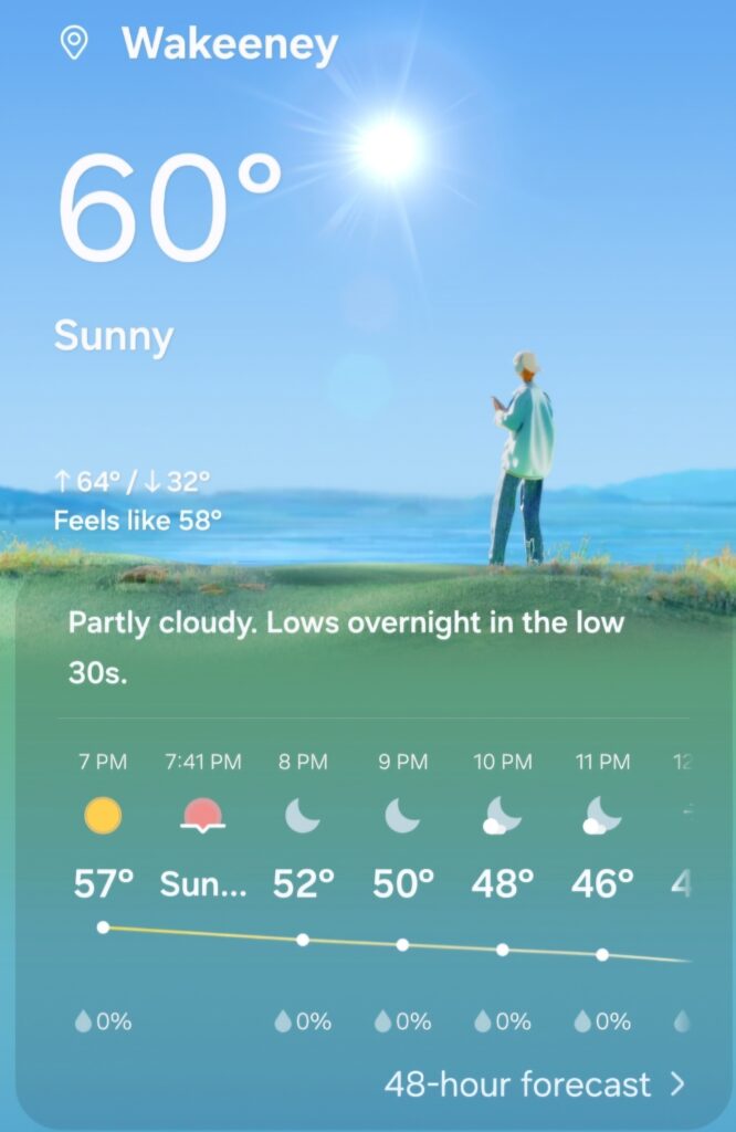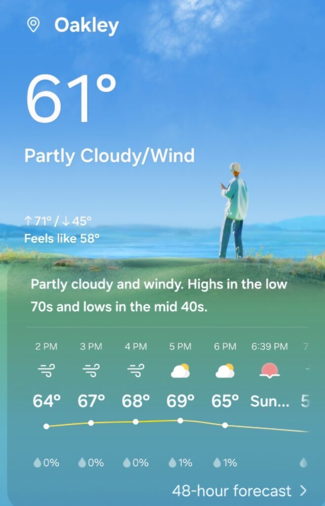 Temperature:61°F – Partly Cloudy – Moderate Wind